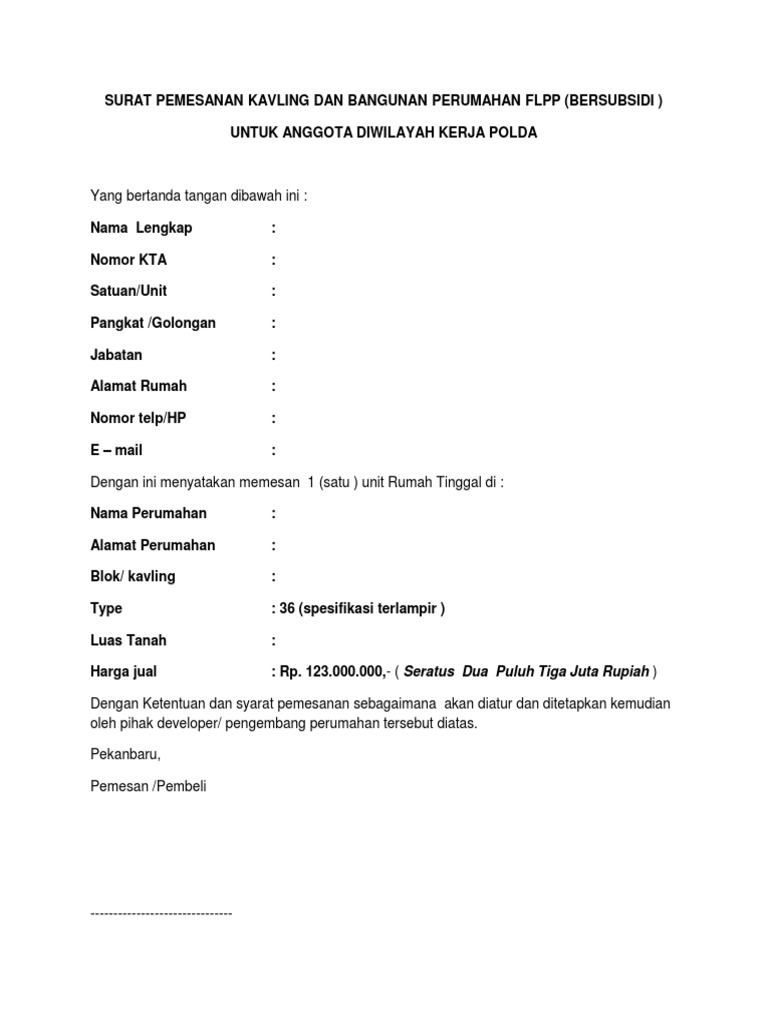 Surat Pemesanan Kavling Dan Bangunan Perumahan Flpp Pdf